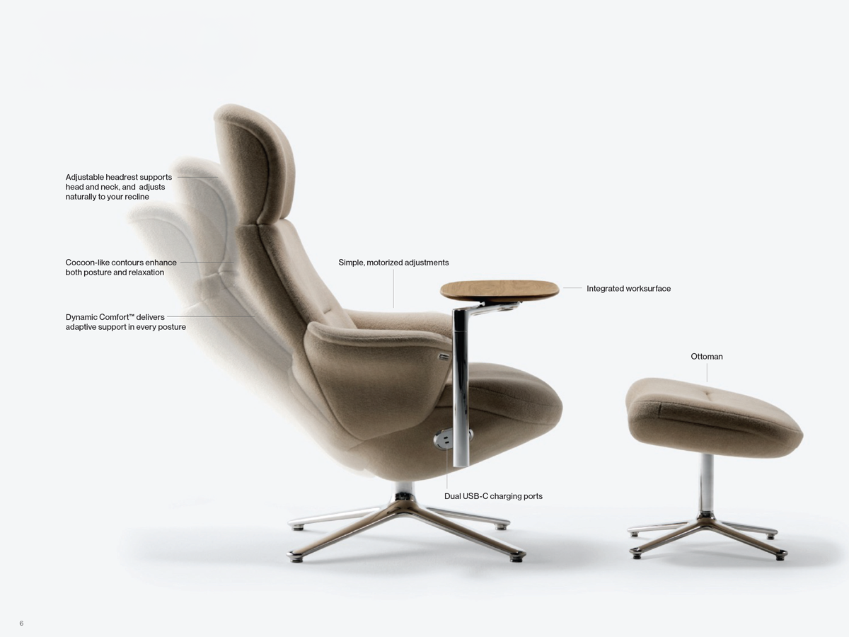 An Integrated Work Tool —providing continuous support for work, rest, and everything in between. Designed by Niels Diffrient, the Diffrient Lounge is a new way to work, lounge, and play—offering continuous support for work, rest, and everything in between. Combining the essential elements of a modern workspace— chair, desk, and power—into a single, elegant solution, it introduces a new typology of working: a seamless, all-in-one environment where productivity, craftsmanship, and comfort coexist.