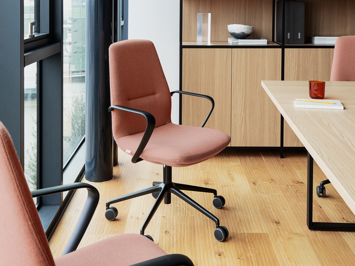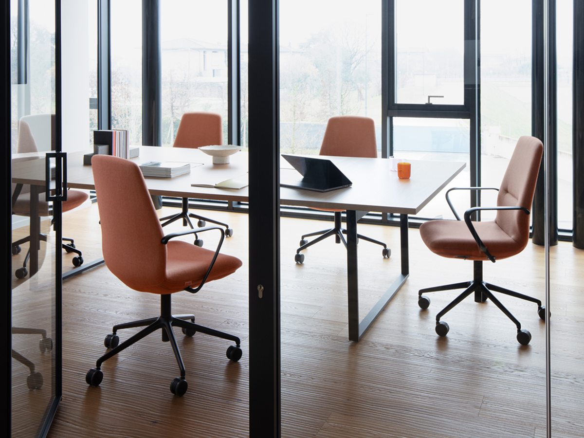 Η σειρά καθισμάτων συνεδριάσεων SYNUA συνδυάζει την τεχνολογία αιχμής με τον κομψό καμπυλωτό σχεδιασμό, προσφέροντας εξαιρετική άνεση και εργονομία. Διαθέτει περιστρεφόμενη τροχήλατη βάση πέντε ακτίνων , μπράτσα αλουμινίου και προηγμένο μηχανισμό συγχρονισμένης ανάκλισης, που επιτρέπει στην πλάτη του καθίσματος να προσαρμόζεται στις κινήσεις του σώματος.
